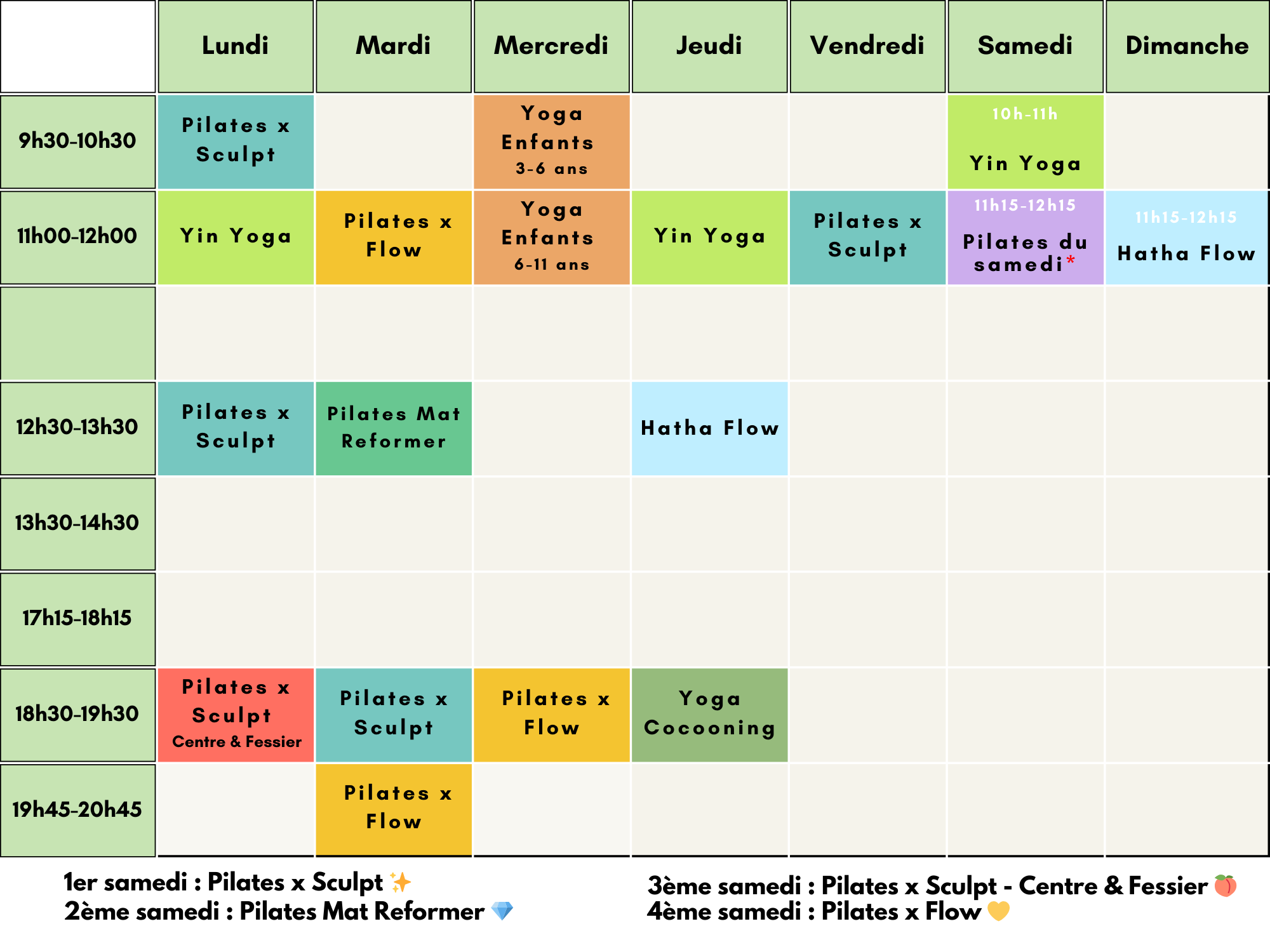 Consultez le planning Bloom Studio Vaux-sur-Mer pour réserver vos cours de Pilates et Yoga. Choisissez l’horaire qui vous convient et rejoignez-nous (Infos dans les onglets en haut de page)