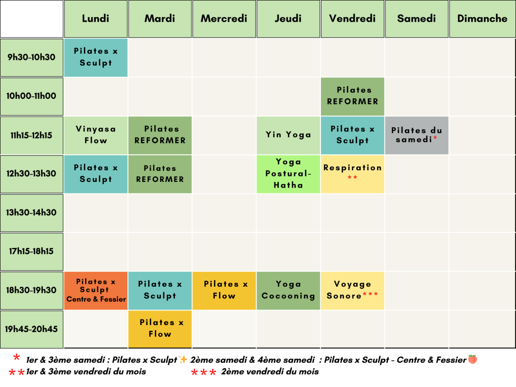 Les séances de Pilates Reformer et Dynamique sont à réserver en ligne. ⚠ Les cours à l’unité, les packs de cours et les abonnements sont soumis à la même politique d’annulation, soit, une annulation sans frais jusqu’à 10 heures avant le début de la séance. Au delà de ce délai ou en cas d’absence sur le cours réservé, le crédit sera PERDU.