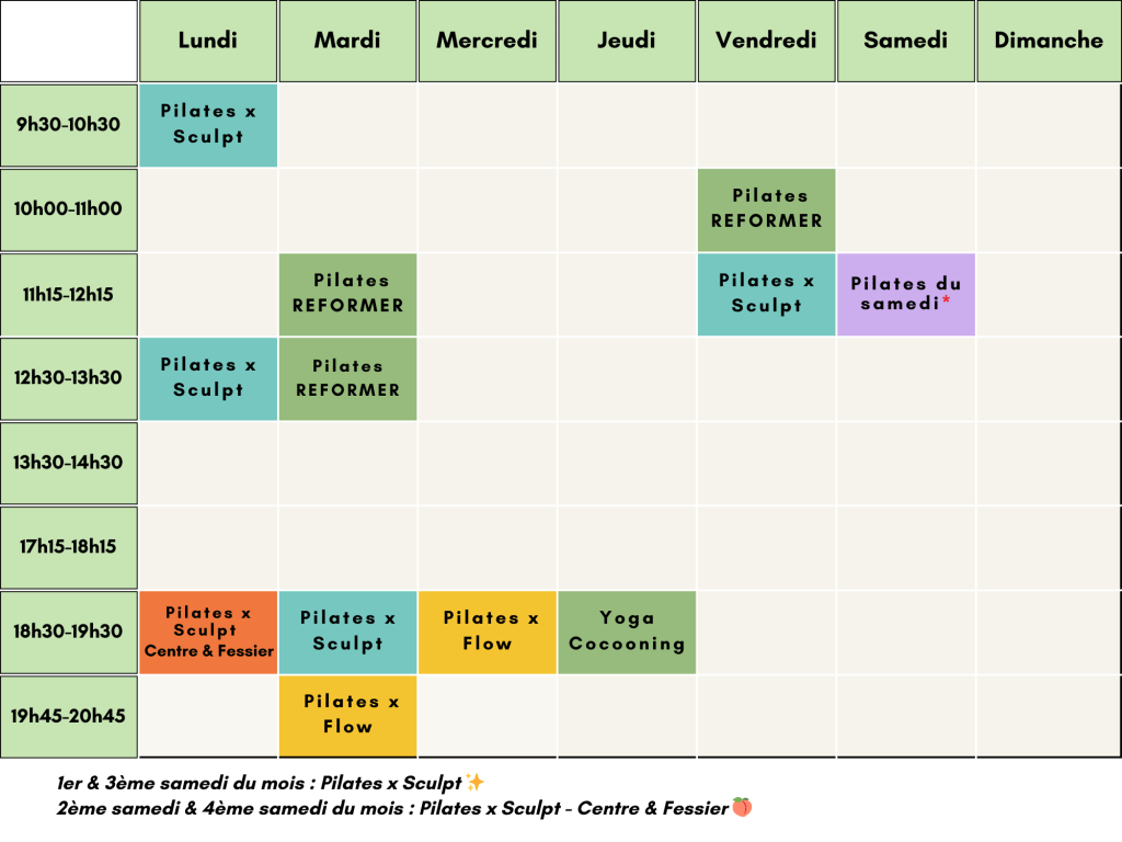 Les séances de Pilates Reformer et Dynamique sont à réserver en ligne. ⚠ Les séances non annulées dans un délai de 2h maximum avant le cours seront dues.