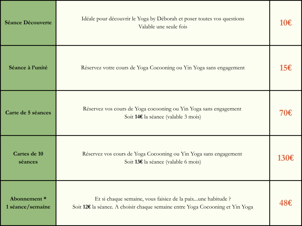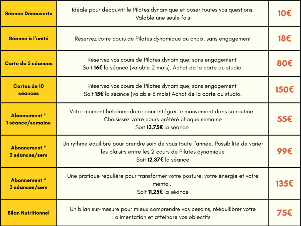 *Abonnement mensuel par prélèvement, reportable lors de vos congés annuels ou congés d’une professeure, dans la limite de 2 semaines par an. Engagement d’un an seulement. Un cadeau vous sera offert pour toute souscription🌿